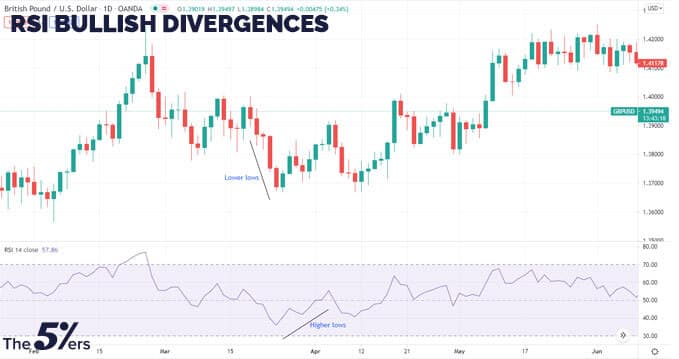 A bullish divergence arises when the RSI produces an oversold reading, which is followed by a higher low that corresponds to proportionately lower lows in the price. This means that bullish momentum is building, and a rise above an oversold area could signal the start of a long position.