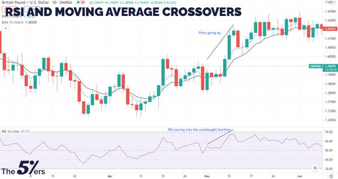 Moving average crossovers that are relatively short-term, such as the five EMA crossing over the ten EMA, are most suited to support RSI.